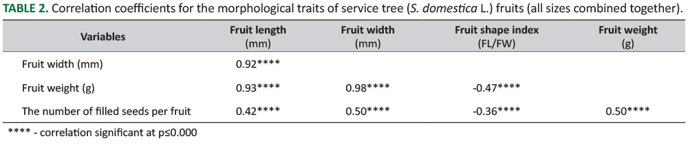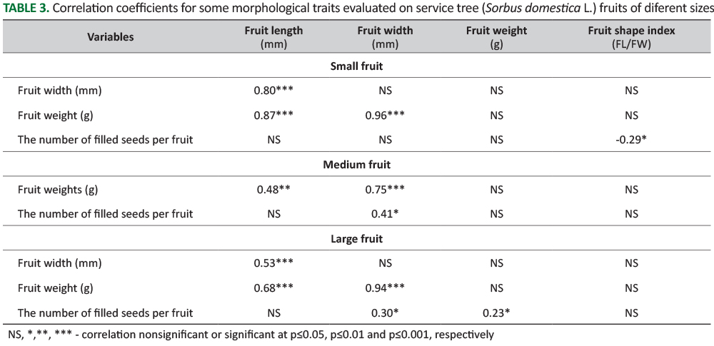 In the case of large fruits, a positive and very high correlation was obtained between fruit width and weight (r=0.94). Statistically significant (p≤0.001) difference was found between fruit length and width (r=0.53) and between fruit length and weight (r=0.68). Less positive, but statistically significant (p≤0.05) correlation was obtained between the number of filled seeds in fruit and fruit width (r=0.30) and fruit weight (r=0.23) (Table 3).