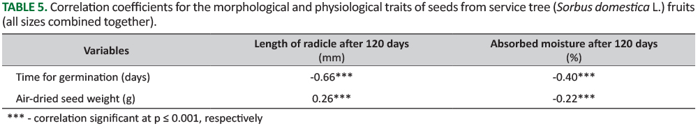 For seeds from medium and large fruits a negative and significant (r=-0.49) correlation was obtained between the length of radicle after 120 days of stratification and the time needed for seed germination, as well as between the percentage of moisture absorption after 120 days of stratification and the time needed for the beginning of seed germination (r=-0.33). The difference between the above-mentioned parameters was significant at p≤0.01. Although negative and small, but statistically significant (p≤0.001), the correlation was obtained between the percentage of moisture absorption after 120 days of stratification and seed weight in air-dried condition (r=-0.32) (Table 6).