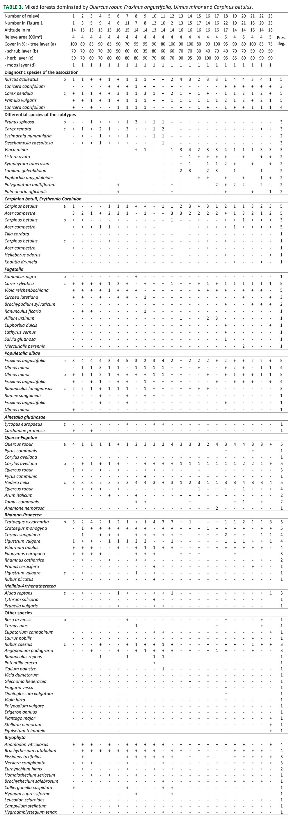 Mixed hardwood forests of the studied area are presented with 23 new relevés in Table 3. They grow in drier terrains which are up to 2 m higher than the previous community. They are flooded only in some areas and very rarely, only in extremely wet years in early spring or late fall. The type of soil is pseudogley on alluvial deposits, and such conditions have also reflected on the floristic composition with fewer hygrophytes and more mesophilous species.
