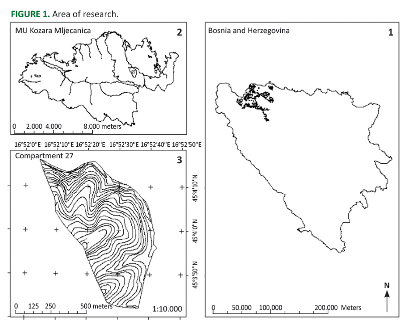 The research object is Compartment 27, which belongs to Forest Administration Unit "Prijedor". It is located between the latitude of 16°52′4.612″ and 16°52′42.153″ and the longitude of 45°3′42.255″ and 45°4′16.017″ (Figure 1). The area belongs to moderate continental climate. The area of Compartment 27 is 46.72 ha and it is covered by forests of beech and fir. Management system is group selection. Total volume per ha amounts to 365.94 m3·h-1, while volume increment is 8.34 m3·h-1. The cutting of marked trees is carried out by the assortment harvesting method.