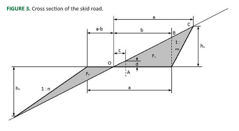 The unit cost of the construction of skid roads is determined on the basis of bulldozer productivity of 0.0475 h·m-³ and its labor cost of 35.90 €·m-³, thus amounting to 1.71 €·m-³ of soil [9]. Total cost of the construction of skid roads is the product of unit cost of the construction and the volume of earthwork. The volume of earthwork is determined on the basis of terrain slope at the station points of the skid road, which are laid at each 50 m of the road, and length of the skid road (Figure 3).