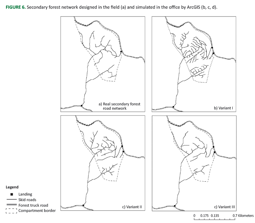 In this investigation the new secondary road network is laid in the field and it is compared with three simulated variants of secondary network that are laid by ArcGIS 10.3. These variants are based on different average winching distances of 10, 20 and 30 m.